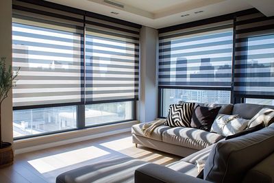 Vision blinds combine two layers of fabric with alternating sheer and opaque stripes, giving you complete control of light and privacy. Line the stripes up for soft light or offset them for full shading.